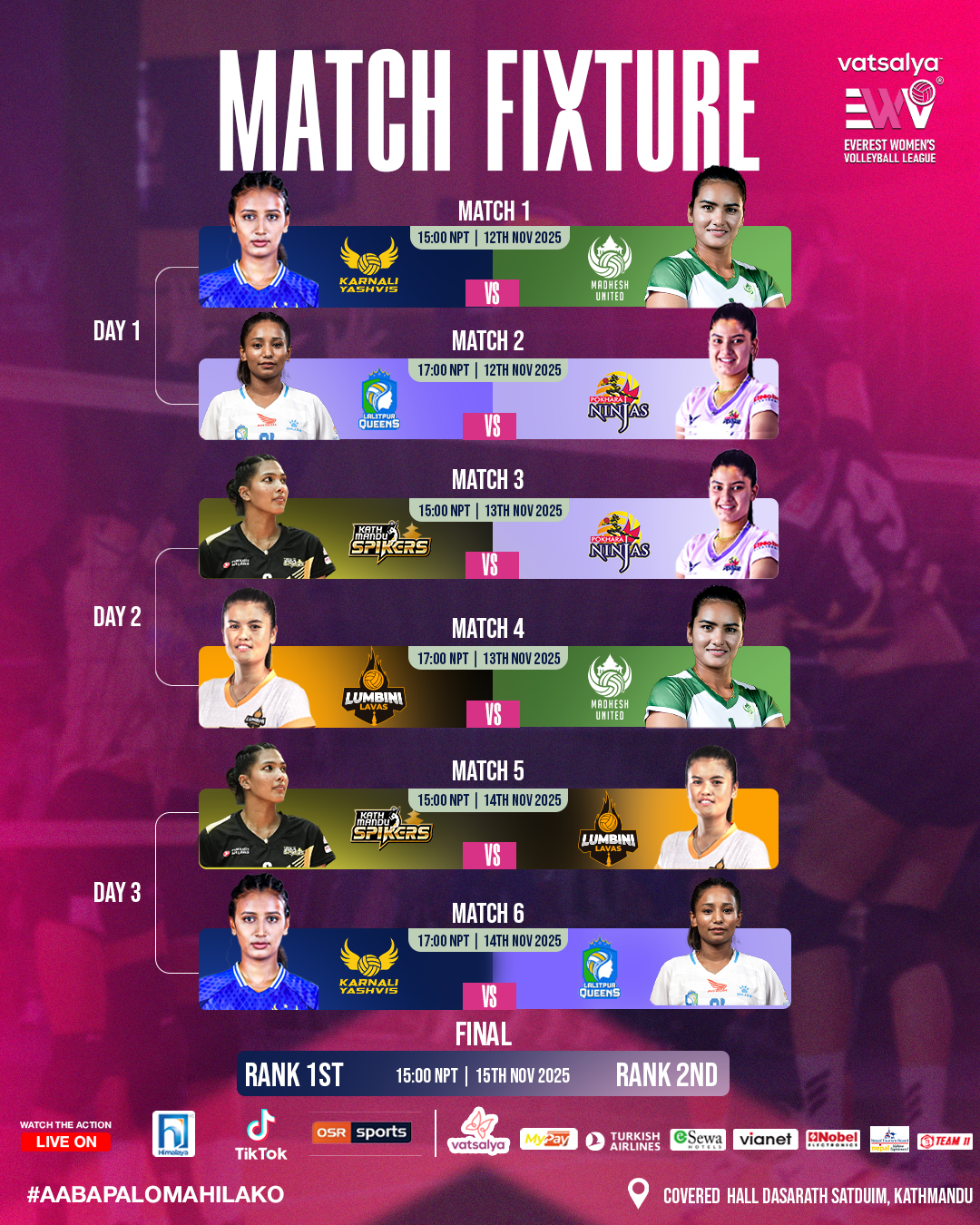 Generated by OK AI. Editorially reviewed.- वात्सल्य एभरेष्ट महिला भलिबल लिगको दोस्रो संस्करणका बाँकी खेलहरूको तालिका कात्तिक २३ मा सार्वजनिक भएको छ।