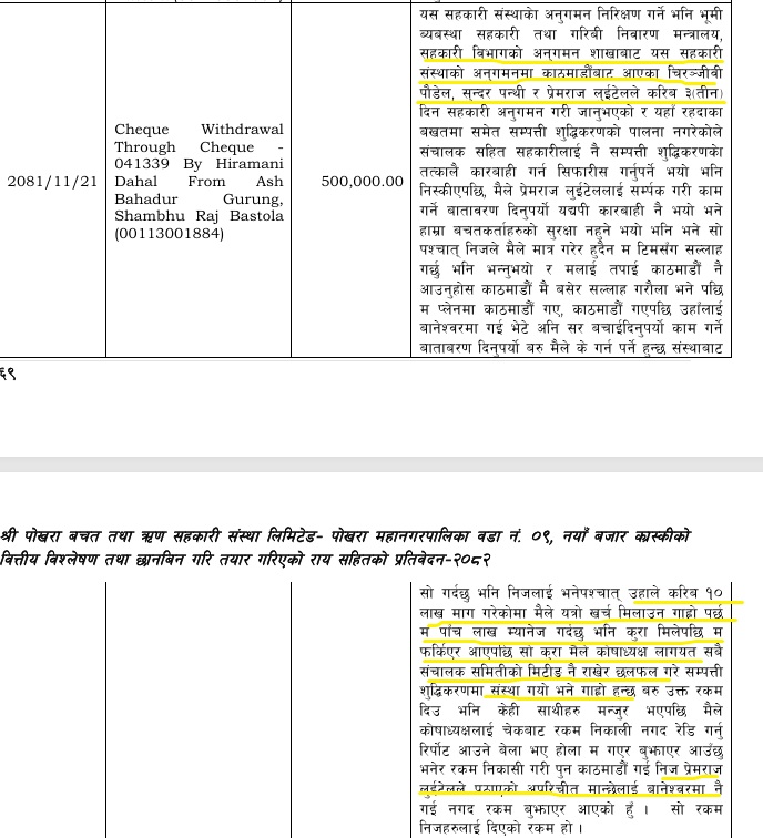 पोखरा सहकारीका अध्यक्ष सुरेन्द्रबहादुर गोदार, प्रवन्धक भीष्मप्रताप गुरुङ, कोषाध्यक्ष हिरामणि दाहाललगायतले वित्तीय विश्लेषणका क्रममा लिइएको बयानमै यो तथ्य खुलाएका हुन् ।