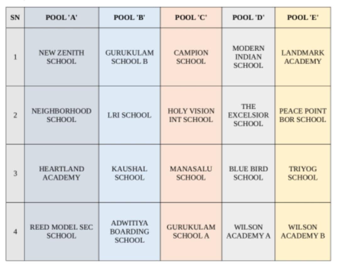 प्रतियोगितामा सहभागी स्कुललाई विभिन्न पाँच समूहमा विभाजन गरिएको छ । हरेक समूहमा चार-चार टोली छन् ।