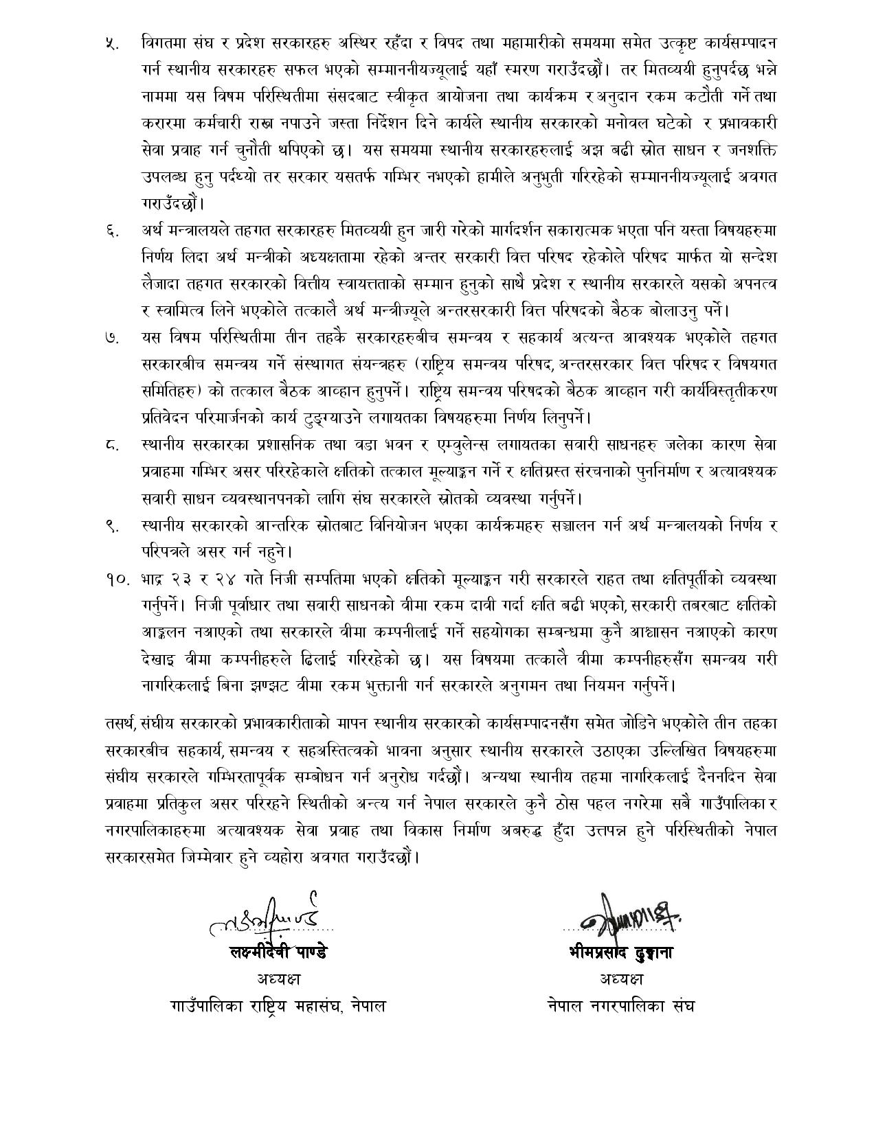 ज्ञापन पत्रमा फागुन २१ गतेको निर्वाचन सम्पन्न गराउने संघ सरकार र निर्वाचन आयोगसँग सहकार्य गर्न स्थानीय सरकार प्रतिबद्ध रहेको भन्दै राजनीतिक दलहरूका बीच आपसी विश्वास र समझदारी बनाउन सरकारको ध्यानाकर्षण गराइएको छ ।