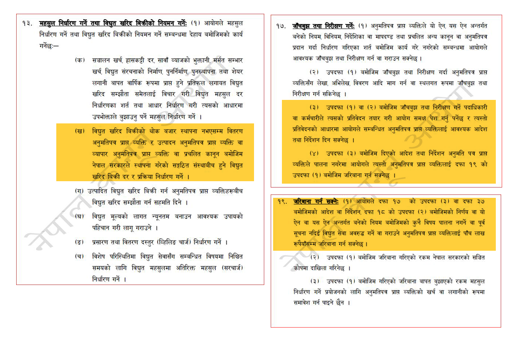 ऐन, नियमावली तथा निर्देशिका पालना नगर्ने विद्युत् प्राधिकरण जस्ता कम्पनीलाई नियमन आयोगले ५ लाखसम्म जरिबाना गर्न सक्ने व्यवस्था ऐनको दफा १९ को उपदफा १ मा छ ।