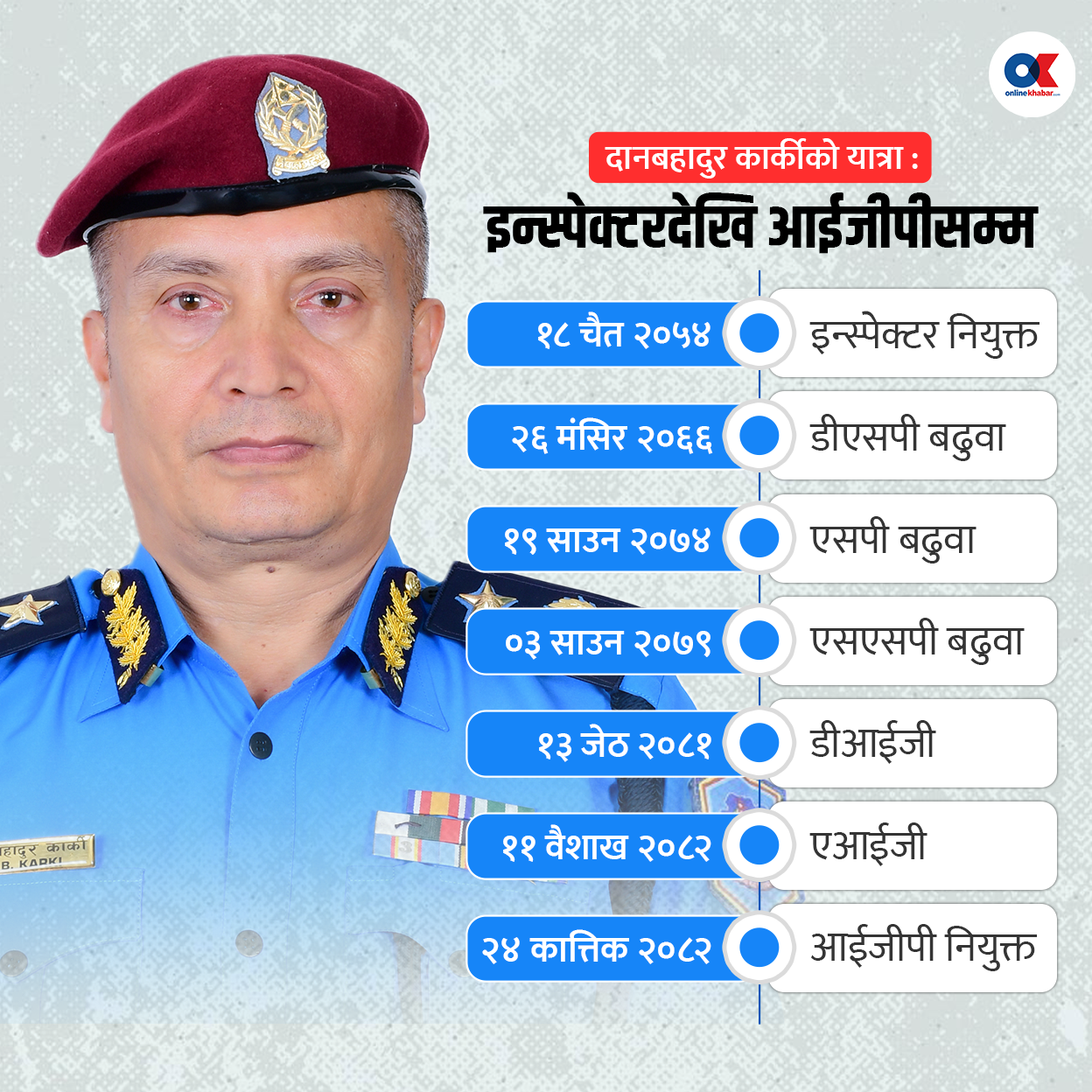 उनै कार्कीलाई सोमबार बसेको मन्त्रीपरिषद् बैठकले ३३ औं आईजीको रुपमा नियुक्त गर्यो । प्रहरी नियमावलीमा उल्लेख रहेको ३० वर्षे सेवा अवधिका कारण वर्तमान आईजीपी चन्द्रकुवेर खापुङ २६ कात्तिक राति १२ बजेबाट अनिवार्य अवकाशमा जाँदैछन् । तयसछि २७ कात्तिकदेखि कार्कीले नेतृत्व सम्हाल्नेछन् ।