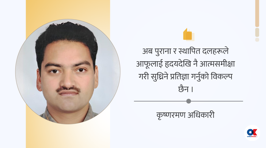 अब पुराना र स्थापित दलहरूले आफूलाई हृदयदेखि नै आत्मसमीक्षा गरी सुध्रिने प्रतिज्ञा गर्नुको विकल्प छैन। दलहरूले समीक्षा गरेर मात्र पुग्ने छैन समयानुकूल दलको पुनर्गठन समेत गर्नु अनिवार्य हुन्छ र आफूलाई परिष्कृत र परिमार्जित गर्दै नयाँ ऊर्जा सहित चुनावमा जानु देश, लोकतन्त्र तथा दल स्वयंको लागि समेत हितकर हुनेछ। अन्यथा समयले कसैलाई पर्खने छैन।