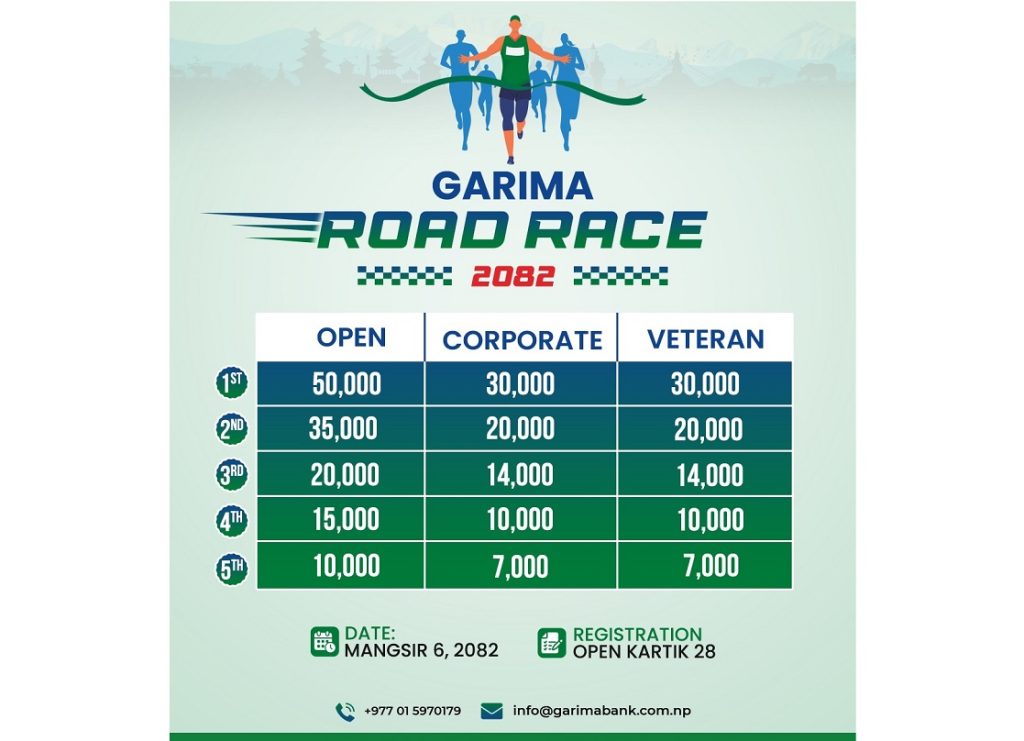 Generated by OK AI. Editorially reviewed.- गरिमा विकास बैंकले १९ औं वार्षिकोत्सवको अवसरमा मंसिर ६ गते दोस्रो संस्करणको रोड रेस प्रतियोगिता आयोजना गर्ने भएको छ।