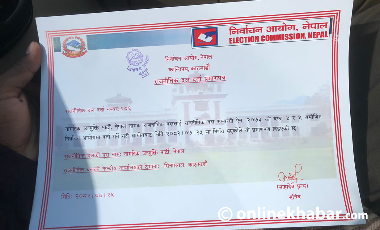 - नागरिक उन्मुक्ति पार्टीले १३ कात्तिकमा दल दर्ताका लागि निवेदन दिएको थियो र आयोगले प्रमाणपत्र दिएको छ।