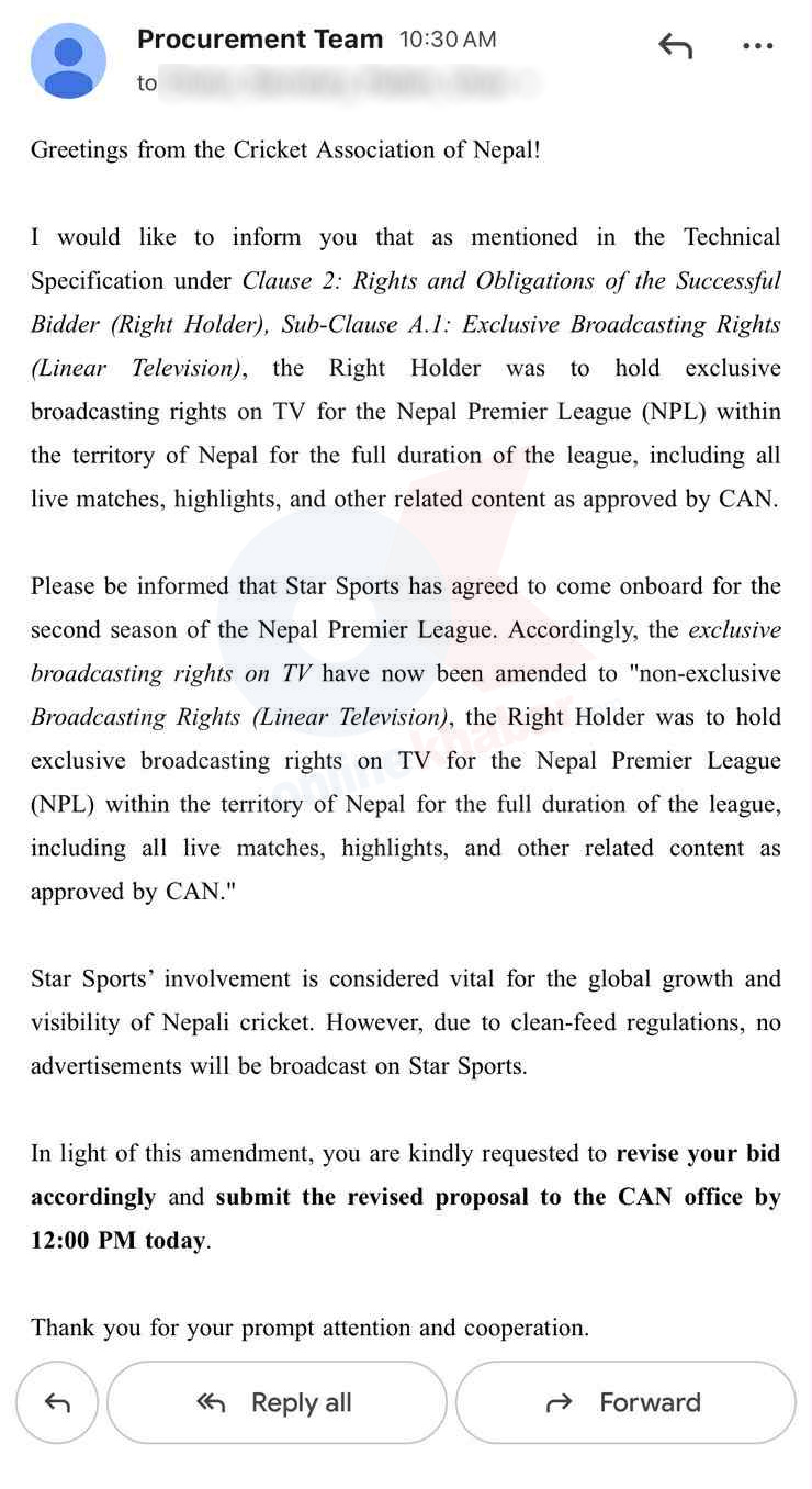 बुधबार मात्रै क्यानले टेन्डर हालेका कम्पनीलाई इमेल गरेर स्टार स्पोर्ट्सले एनपीएलको प्रत्यक्ष प्रसारण गर्ने र नेपाली टेलिभिजन च्यानललाई ‘नन एक्सक्लुसिभ राइट्स’ दिने जानकारी गराएको थियो ।