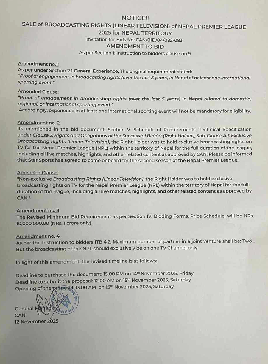 पहिलो बिडिङ फारम बाँड्दा नेपालको टेलिभिजनलाई पनि एक्सक्लुसिभ भनिएकोमा अन्तिम समयमा त्यसलाई परिवर्तन गर्दै नेपाली टीभीलाई ननएक्सक्लुसिभ दिने जानकारी क्यानले गराएको हो ।