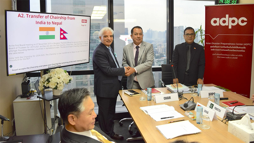 थाइल्याण्डको बैंककमा आज सम्पन्न एडिपिसिको बोर्ड अफ ट्रष्टिजको बैठकमा भारतको राष्ट्रिय आपदा प्रबन्धन प्राधिकरणका प्रमुख राजेन्द्र सिंहले राष्ट्रिय विपद् जोखिम न्यूनीकरण तथा व्यवस्थापन प्राधिकरणका कार्यकारी प्रमुख ई.दिनेश भट्टलाई नेतृत्व हस्तान्तरण गरे ।