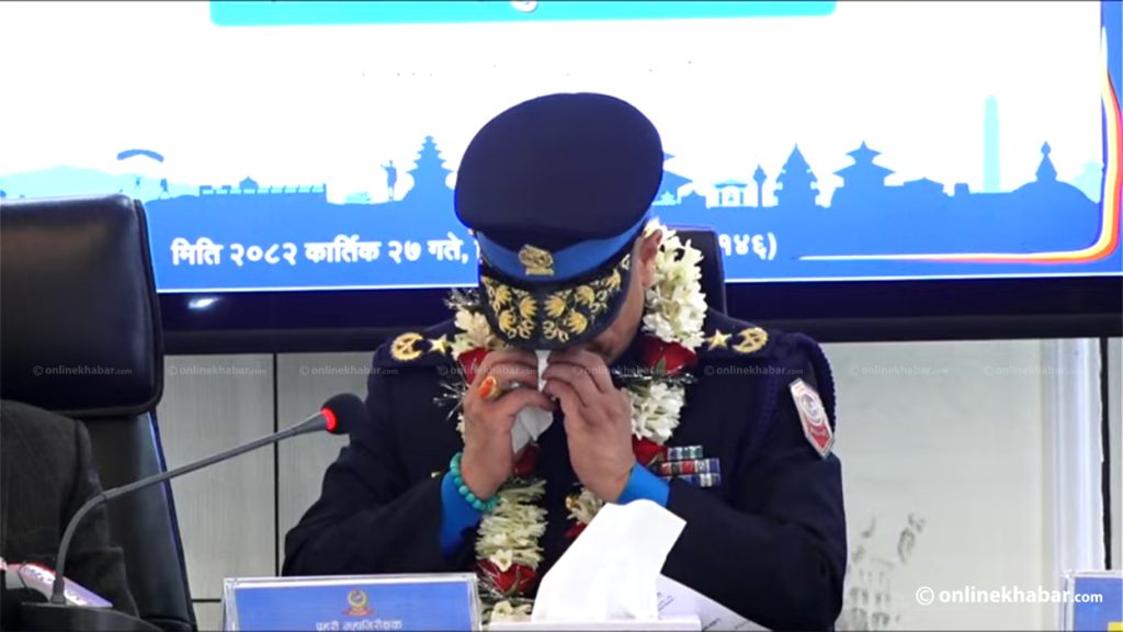 २७ कात्तिक, काठमाडौं । नवनियुक्त प्रहरी महानिरीक्षक दानबहादुर कार्की दर्ज्यानी चिह्न लगाएपछि सम्बोधन गर्ने क्रममा भक्कानिएका छन् । सम्बोधनको सुरुमा अमर प्रहरीको प्रसंग आउँदा उनका गला अवरुद्ध भएका थिए ।