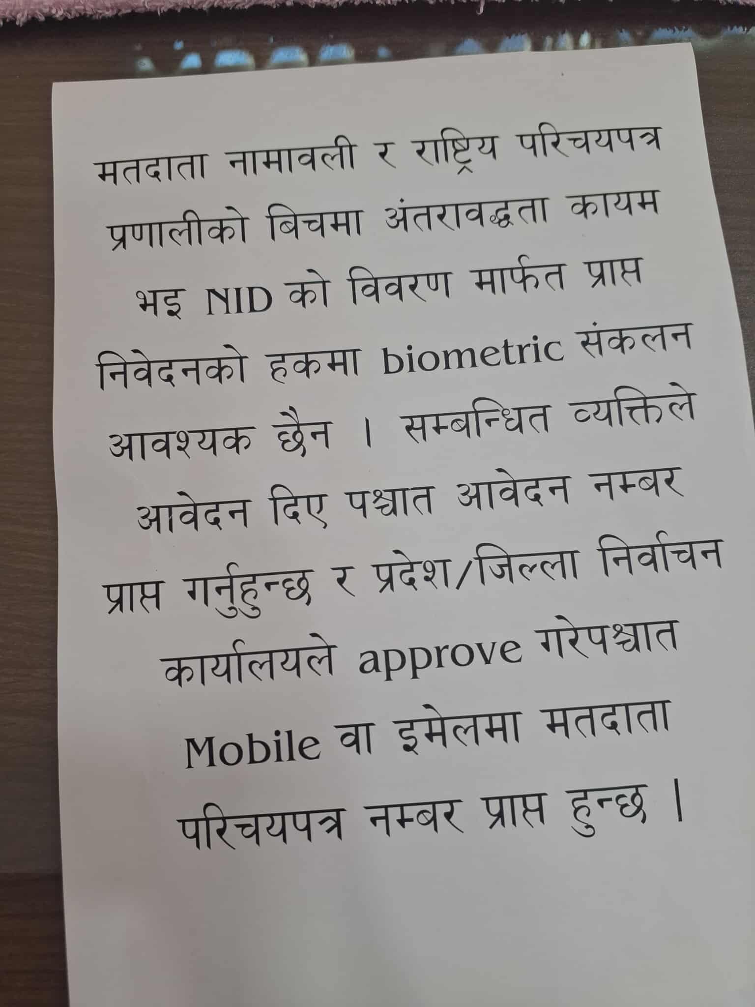 ‘अहिले हाम्रो नेशनल आइडि (राष्ट्रिय परिचयपत्र) को भण्डारमा जम्मा भएको बायोमेट्रिक अनलाइनमा भर्नुभएको निवेदनमा ल्याएर जोड्ने र छानविन गरेर नामावली प्रकाशन गर्ने भन्ने निर्णय गरेका छौँ । त्यसले तपाईंहरूका सबै मागलाई सम्बोधन गर्दछ,’ भण्डारीले भने ।