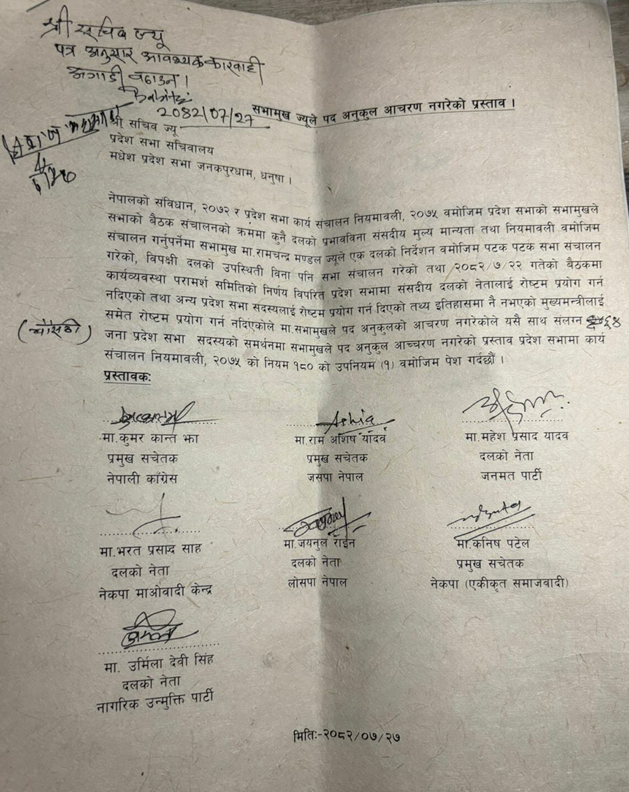 २७ कात्तिक, जनकपुरधाम । मधेश प्रदेशका सभामुख रामचन्द्र मण्डलले पद अनुकूल आचारण नगरेको प्रस्ताव दर्ता गर्न सात राजनीतिक दलका सांसदहरू प्रदेश सभा सचिवालय पुगेका छन् ।