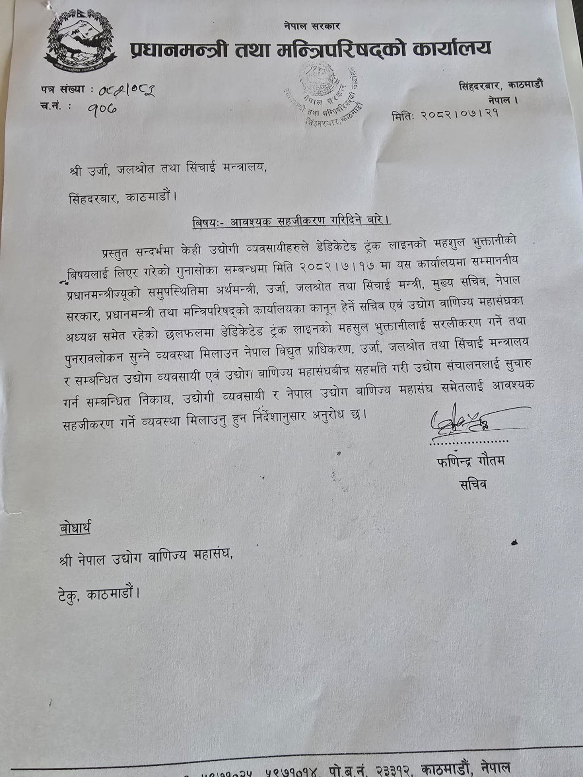 ‘१७ कात्तिक २०८२ मा यस कार्यालयमा प्रधानमन्त्रीज्यूको समुपस्थितिमा अर्थमन्त्री, उर्जामन्त्री, मुख्यसचिव, नेपाल सरकार, प्रधानमन्त्री तथा मन्त्रिपरिषद्को कार्यालयका कानुन हेर्ने सचिव एवं उद्योग वाणिज्य महासंघका अध्यक्ष समेत रहेको छलफलमा डेडिकेटेड र ट्रंक लाइनको महसुल भुक्तानीलाई सरलीकरण गर्ने तथा पुनरावलोकन सुन्ने व्यवस्था मिलाउन विद्युत् प्राधिकरण, ऊर्जा मन्त्रालय र सम्बन्धित उद्योगी–व्यवसायी एवं उद्योग वाणिज्य महासंघबीच सहमति भएको’ पत्रमा उल्लेख छ ।