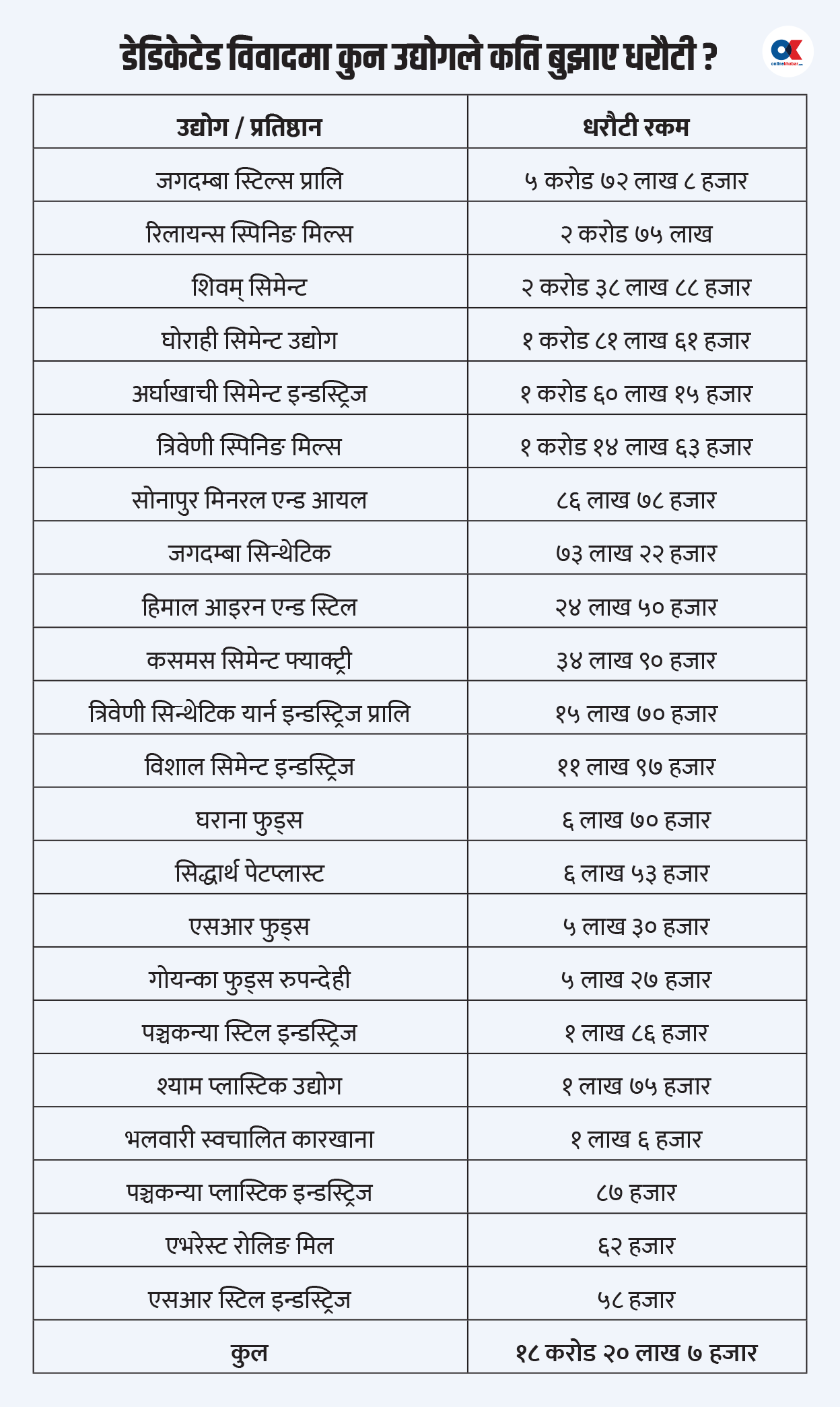 - उद्योगीहरूले माघ २०७२ देखि वैशाख २०७५ सम्मको बक्यौताको २८ किस्ताबाट एक किस्ता बराबर रकम धरौटीका रूपमा बुझाएका छन्।