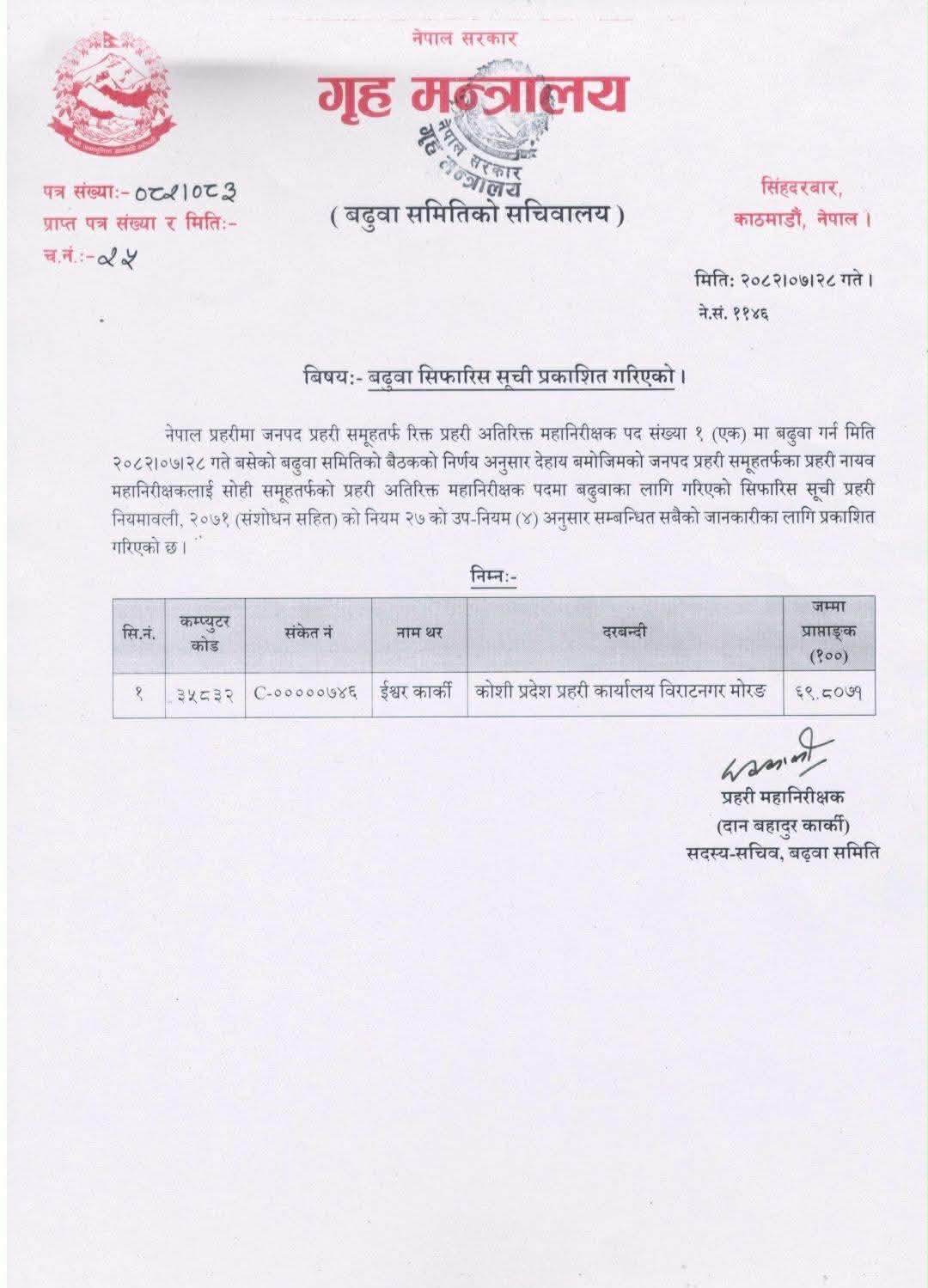 २८ कात्तिक, काठमाडौं । नेपाल प्रहरीको जनपदतर्फ रिक्त रहेको प्रहरी अतिरिक्त महानिरीक्षक (एआईजी) मा ईश्वर कार्कीलाई बढुवा सिफारिस गरिएको छ ।