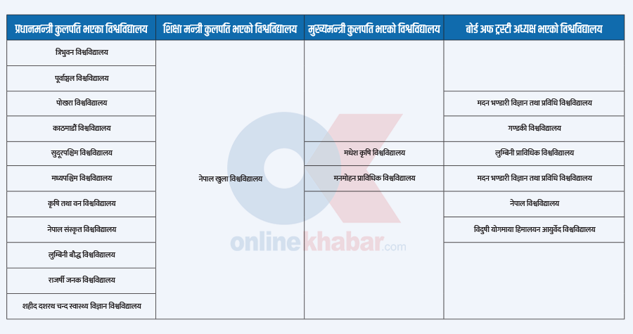 - हाल १० वटा विश्वविद्यालयमा प्रधानमन्त्री कुलपति हुने व्यवस्था छ भने अन्य विश्वविद्यालयमा फरक व्यवस्था लागू छ।