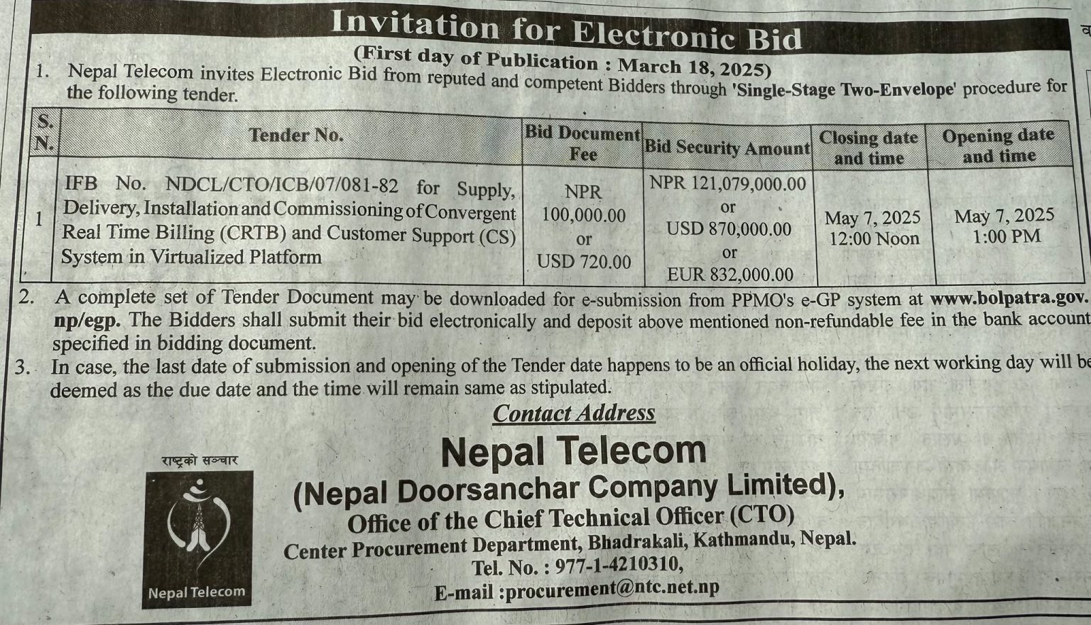 नेपाल टेलिकमले बिलिङ प्रणालीका लागि सन् २०२४ को मार्चमा पहिलो पटक टेन्डर आह्वान गर्यो । उक्त टेन्डर प्रक्रियामा अमेरिकी कम्पनी सिएसजी इन्टरनेसनलले मात्र भाग लियो । एउ६ कम्पनीले मात्रै प्रस्ताव हालेपछि त्यो प्रक्रिया रद्द भएको थियो ।