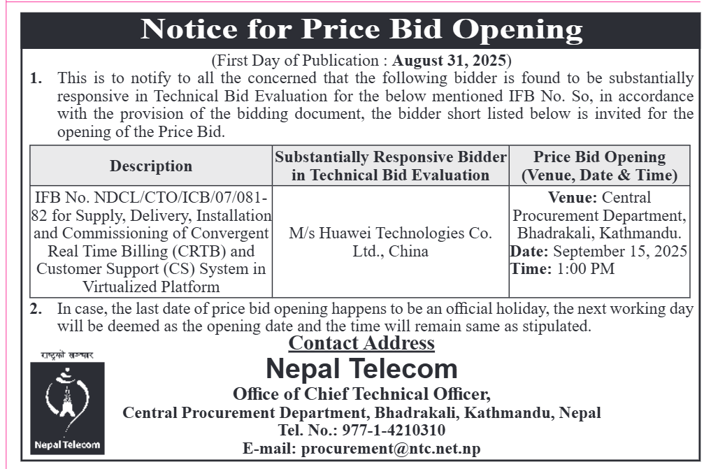 प्राविधिक मूल्याङ्कनमा दुई कम्पनीमध्ये हुवावेमात्रै छनोट भएको छ । खरिद कानुन अनुसार प्रविधिक रुपमा योग्य कम्पनीहरुको आर्थिक प्रस्ताव खोलिन्छ । त्यसो गर्दा जुन कम्पनीको मूल्य सबैभन्दा कम हुन्छ त्यही कम्पनीले ठेक्का पाउँछ । तर प्राविधिक मूल्यांकनमा हुवावे मात्र छनोट भएकाले यो ठेक्का उसैले पाउने निश्चित छ ।