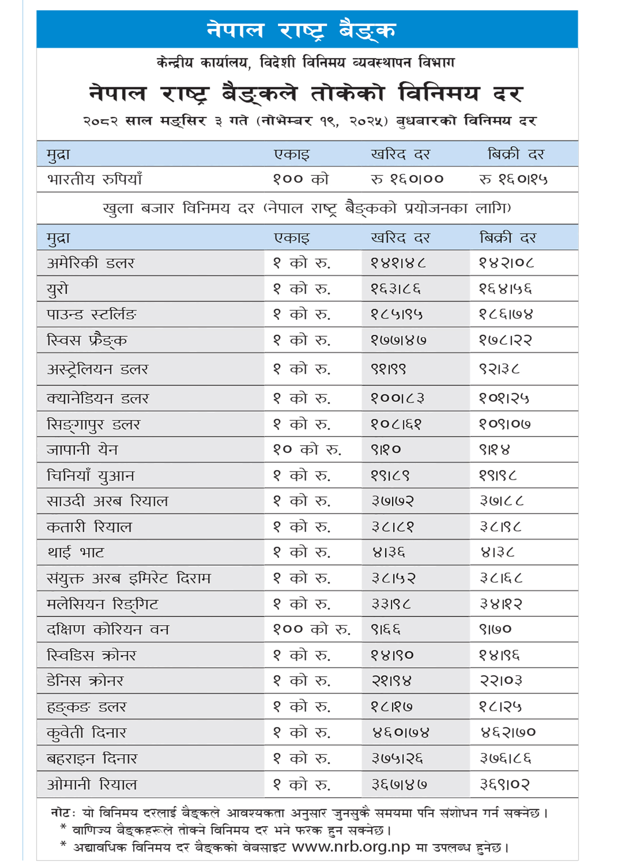केन्द्रीय बैंकका अनुसार थाइ भाट एकको खरिददर चार रुपैयाँ ३६ पैसा र बिक्रीदर चार रुपैयाँ ३८ पैसा, युएई दिराम एकको खरिददर ३८ रुपैयाँ ५२ पैसा र बिक्रीदर ३८ रुपैयाँ ६८ पैसा, मलेसियन रिङ्गेट एकको खरिददर ३३ रुपैयाँ ९८ पैसा र बिक्रीदर ३४ रुपैयाँ १२ पैसा, साउथ कोरियन वन १०० को खरिददर नौ रुपैयाँ ६६ पैसा र बिक्रीदर नौ रुपैयाँ ७० पैसा, स्वीडिस क्रोनर एकको खरिददर १४ रुपैयाँ ९० पैसा र बिक्रीदर १४ रुपैयाँ ९६ पैसा र डेनिस क्रोनर एकको खरिददर २१ रुपैयाँ ९४ पैसा र बिक्रीदर २२ रुपैयाँ ०३ पैसा तोकिएको छ ।