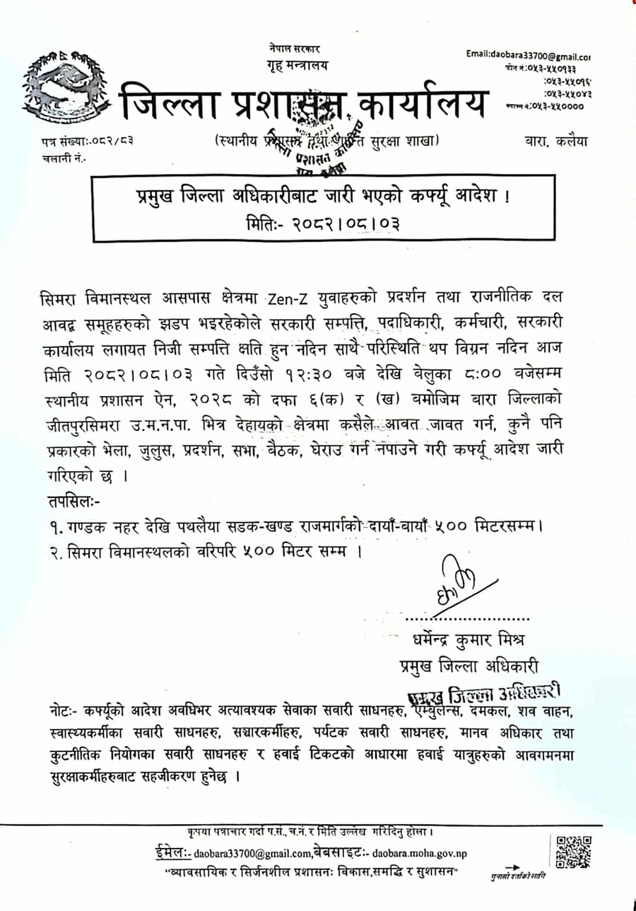 त्यसपछि स्थिति भड्किन नदिने स्थानीय प्रशासनले कर्फ्यू लगाएको हो । गण्डक नहरदेखि पथलैया सडकखण्डको दायाँ-बायाँ ५०० मिटर र सिमरा विमानस्थलको वरिपरि ५०० मिटरसम्म बुधबार दिउँसो १२:३० बजेदेखि राति ८ बजेसम्म कुनै पनि प्रकारको भेला, जुलस, प्रदर्शन, सभा, बैठक, घेराउ लगायतका कार्यक्रम गर्न प्रतिबन्ध लगाइएको छ ।
