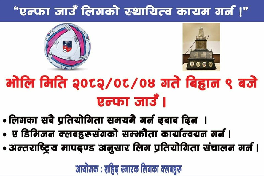 Generated by OK AI. Editorially reviewed.- शहीद स्मारक लिगका ए डिभिजन क्लबहरूले एन्फा कम्प्लेक्सको गेट अगाडि आन्दोलन चर्काउने भएका छन्।