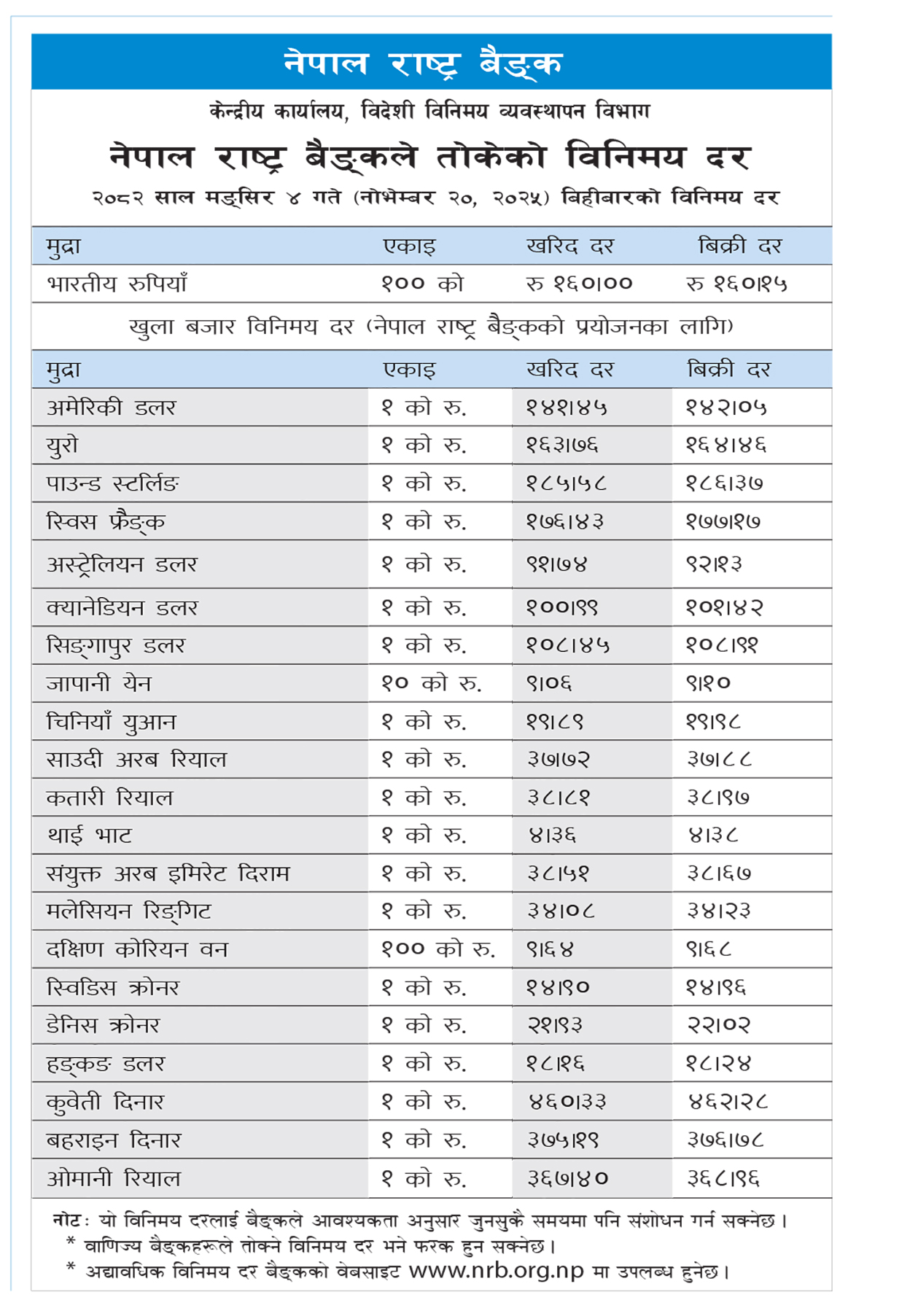 राष्ट्र बैङ्कले हङकङ डलर एकको खरिददर १८ रुपैयाँ १६ पैसा र बिक्रीदर १८ रुपैयाँ २४ पैसा, कुवेती दिनार एकको खरिददर ४६० रुपैयाँ ३३ पैसा र बिक्रीदर ४६२ रुपैयाँ २८ पैसा, बहराइन दिनार एकको खरिददर ३७५ रुपैयाँ १९ पैसा र बिक्रीदर ३७६ रुपैयाँ ७८ पैसा, ओमनी रियाल एकको खरिददर ३६७ रुपैयाँ ४० पैसा, बिक्रिदर ३६८ रुपैयाँ ९६ पैसा रहेको छ । भारतीय रुपैयाँ एक सयको खरिददर १६० रुपैयाँ र बिक्रीदर १६० रुपैयाँ १५ पैसा तोकिएको छ ।