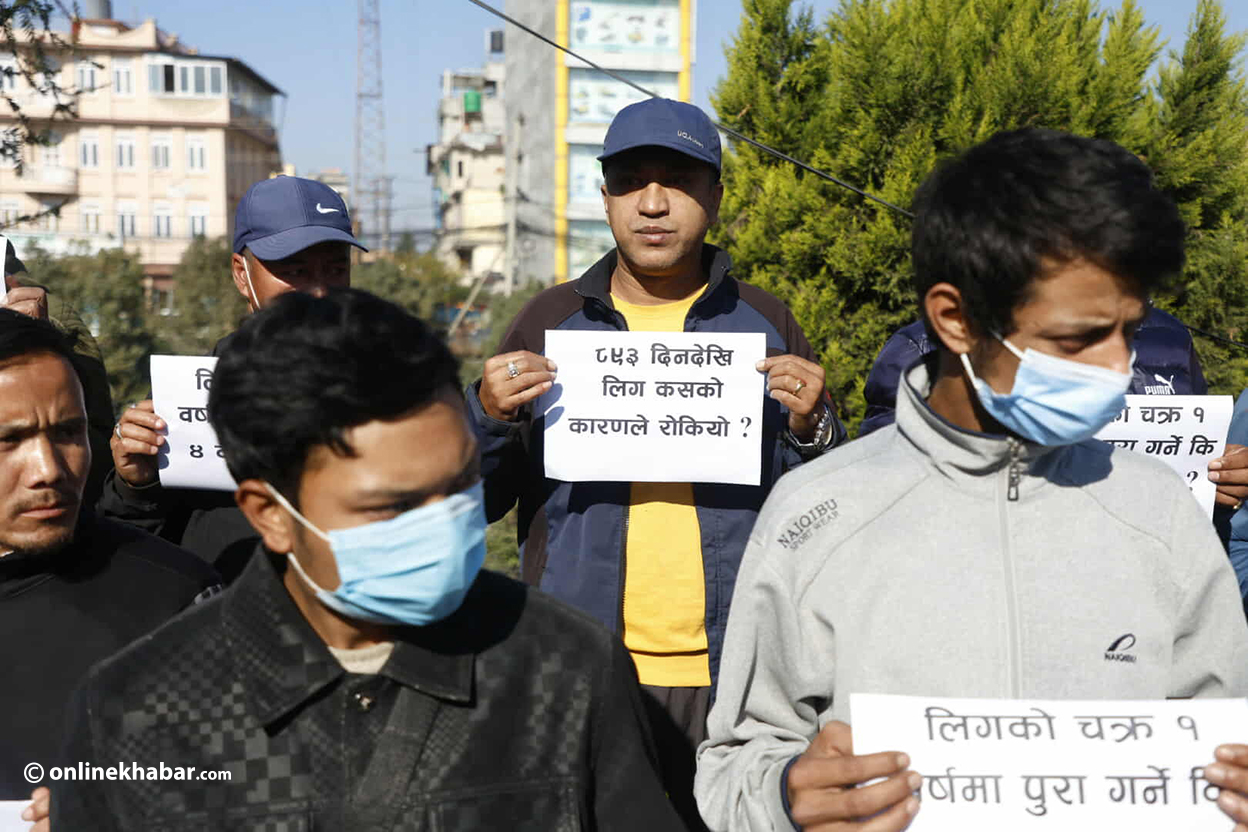 यसअघि नेपाल फुटबल खेलाडी संघले सातदोबाटोस्थित एन्फा कम्प्लेक्स गेटमा धर्ना दिएको थियो । संघले पनि ए डिभिजन लिग तुरुन्त सुरु गर्न माग गर्दै घरेलु फुटबल नियमित गर्नुपर्ने आवाज उठाएको थियो ।