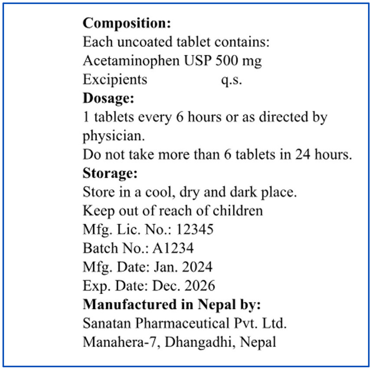 नेपालमा सामान्यतया ट्याब्लेटको पत्तामा पाइने लेबलको एक नमुना हेरी बुझ्ने प्रयास गरौँ ।