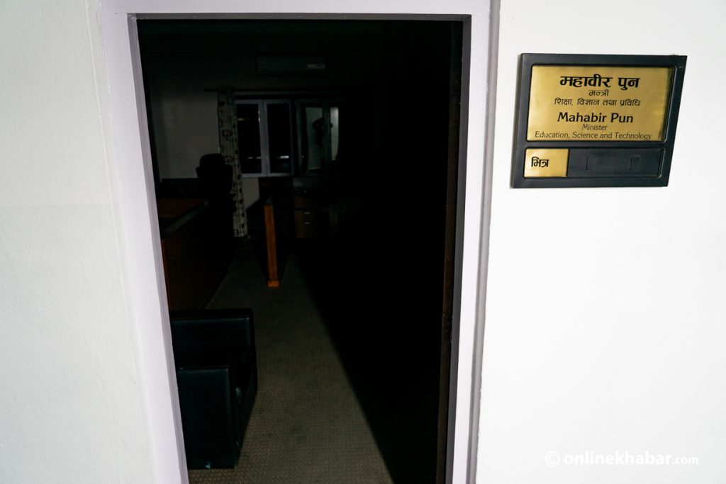 ४ मंसिर, काठमाडौं । ‘कसलाई खोज्नु भएको हो, अँध्यारो छ,’ बुधबार साँझ शिक्षा विज्ञान तथा प्रविधि मन्त्रालयमा पुग्दा एक कर्मचारीले भने । कतिपय कर्मचारी अँध्यारो कोठामा बसेर नै काम गरिरहेका थिए ।