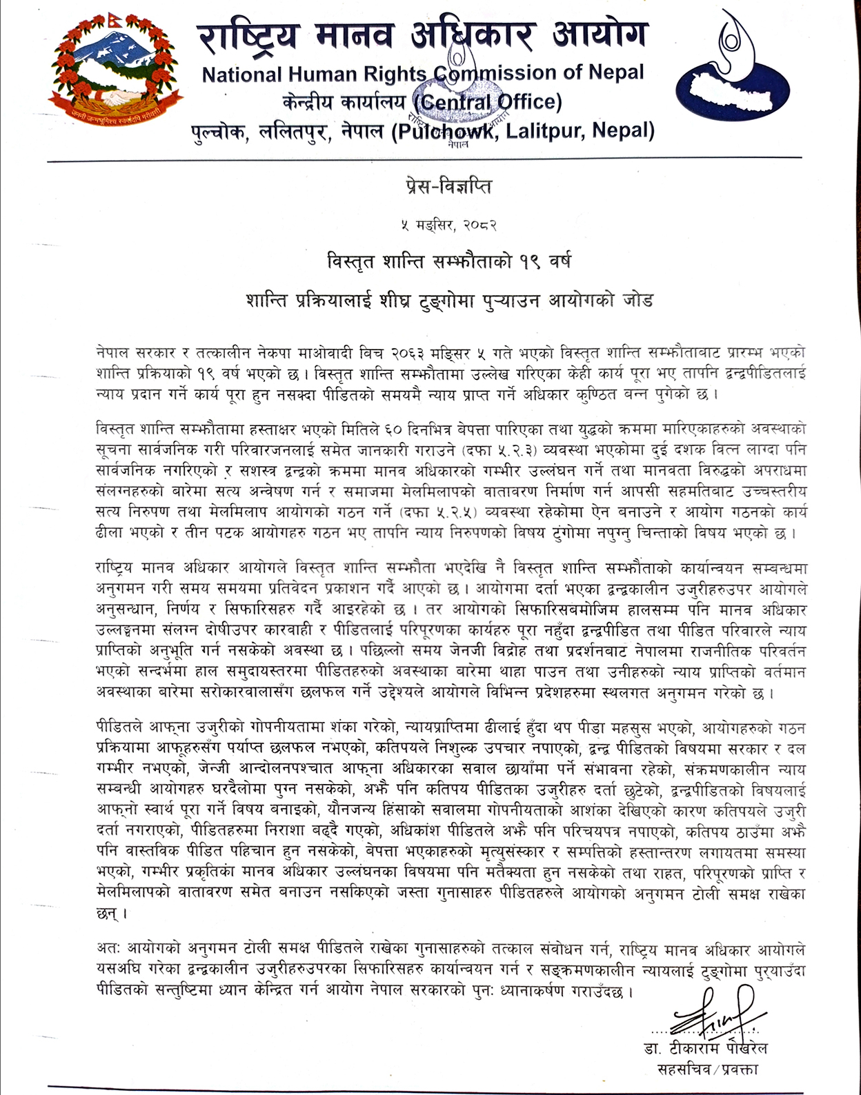२०६३ मंसिर ५ मा नेपाल सरकार र तत्कालीन नेकपा माओवादीबीच विस्तृत शान्ति सम्झौता भएको आज १९ वर्ष पुगेको छ । तर अझै पनि द्वन्द्वपीडितले न्याय पाउन नसकेको आयोगको निष्कर्ष छ । सम्झौतामा ६० दिनभित्र बेपत्ता पारिएका र युद्धमा मारिएका व्यक्तिहरूको अवस्थाबारे सूचना सार्वजनिक गर्ने व्यवस्था भए पनि अझैसम्म जानकारी आएको छैन ।