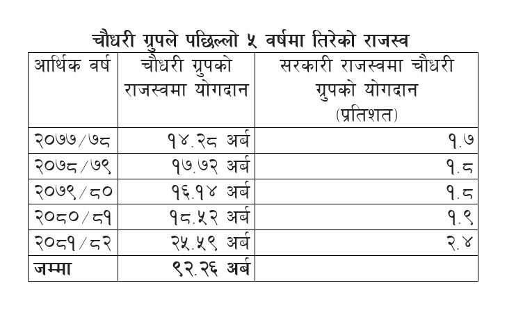 Generated by OK AI. Editorially reviewed.- चौधरी ग्रुपले आर्थिक वर्ष २०८१/८२ मा सरकारलाई २५ अर्ब ५९ करोड रुपैयाँ कर तिरेको छ, जुन कूल राजस्वको २ प्रतिशत हाराहारी हो।