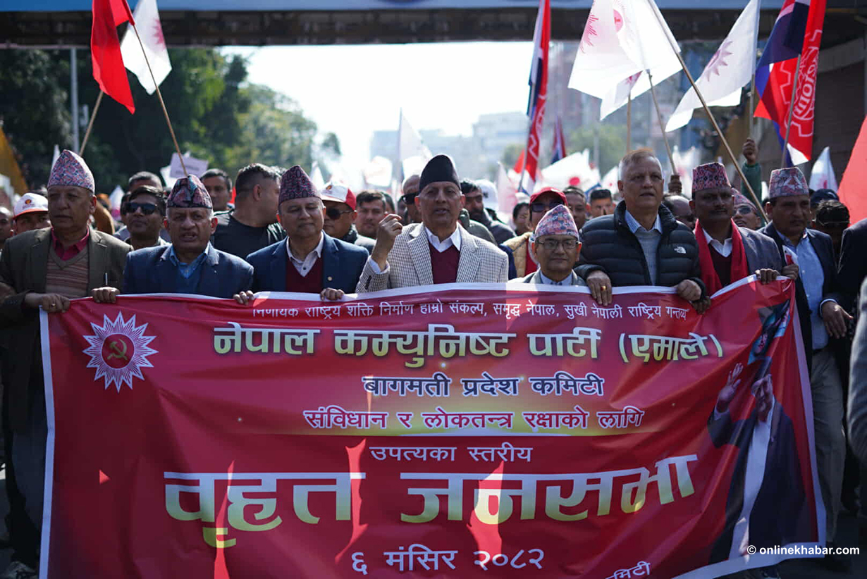 ‘संविधान र लोकतन्त्रको रक्षा हाम्रो साझा जिम्मेवारी !’ भन्ने नाराका साथ एमालेले जनसभा गरेको हो ।