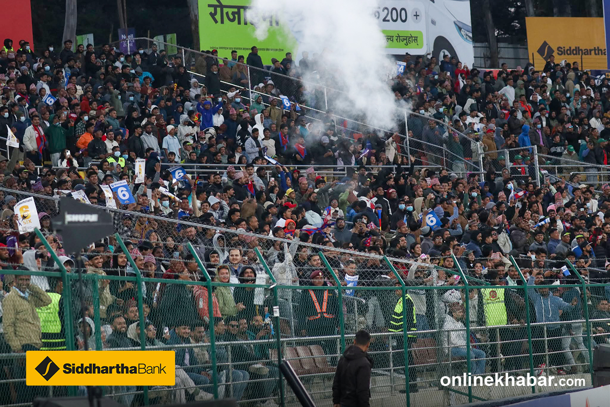 - मैदानमा पुगेका दर्शकको हुटिङले रंगशाला क्षेत्र गुल्जार बनेको छ र अधिकांश दर्शकले दुवै खेल हेरेका छन्।