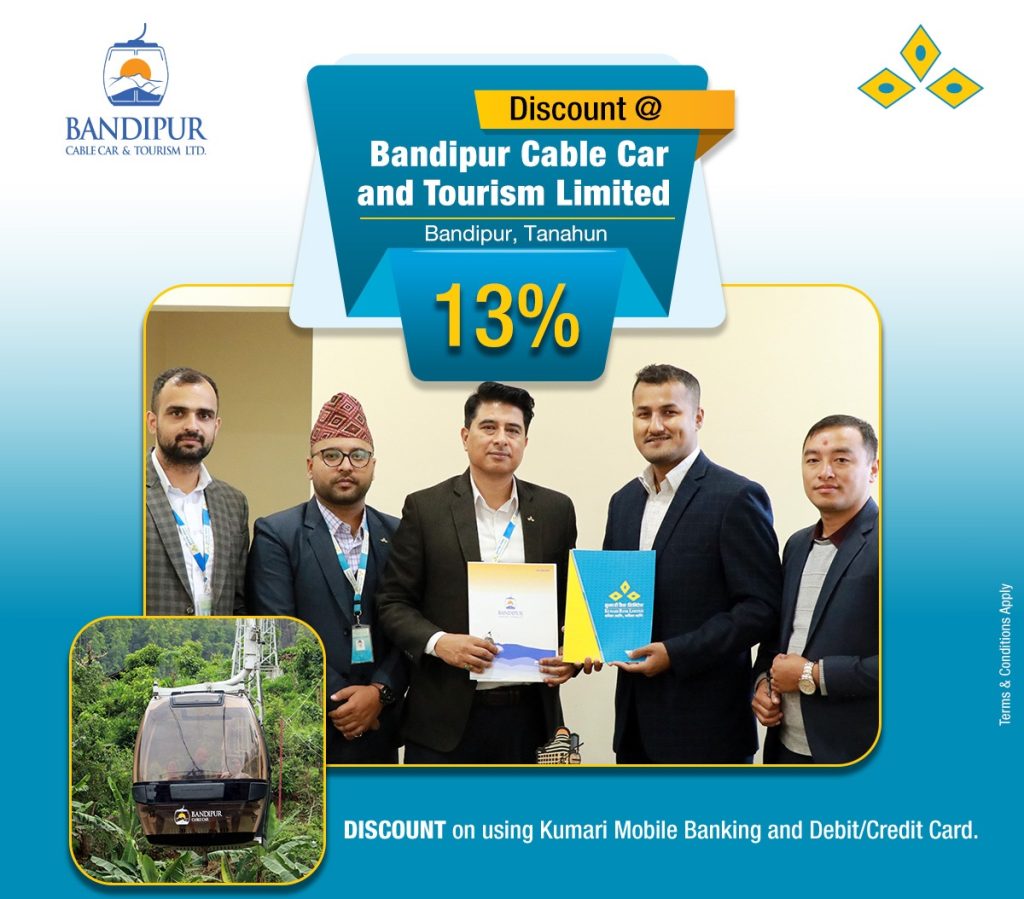 Generated by OK AI. Editorially reviewed.- कुमारी बैंक र बन्दीपुर केबुलकार एन्ड टुरिजम लिमिटेडबीच ग्राहकलाई १३ प्रतिशतसम्म छुट दिने सम्झौता भएको छ।