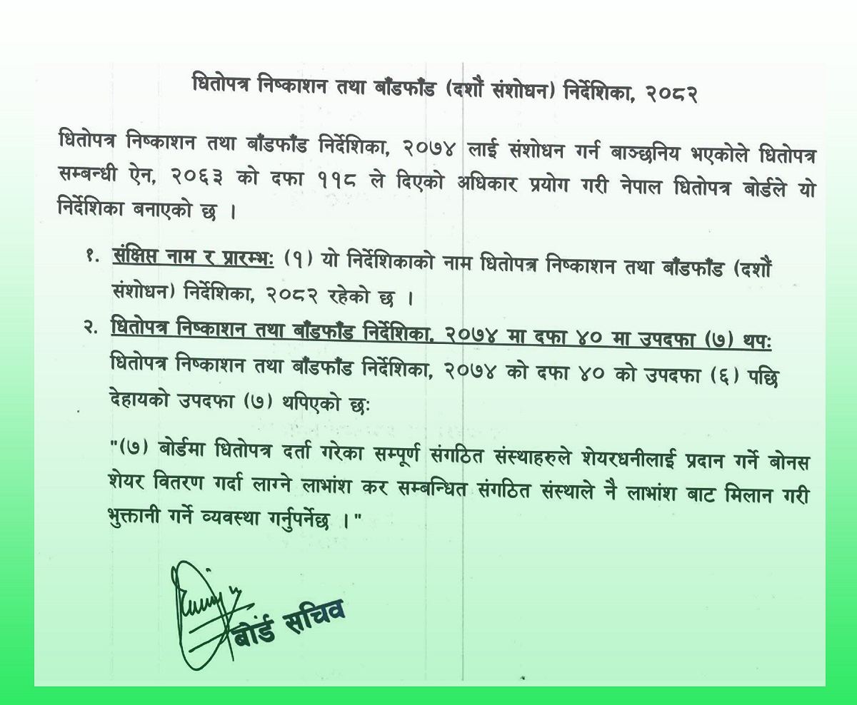 धितोपत्र निष्कासन तथा बाँडफाँट निर्देशिकालाई दशौं पटक संशोधन गर्दै बोर्डले यस्तो व्यवस्था गरेको हो । यसअघि निर्देशिकामा यसलाई समेटिएको थिएन ।
