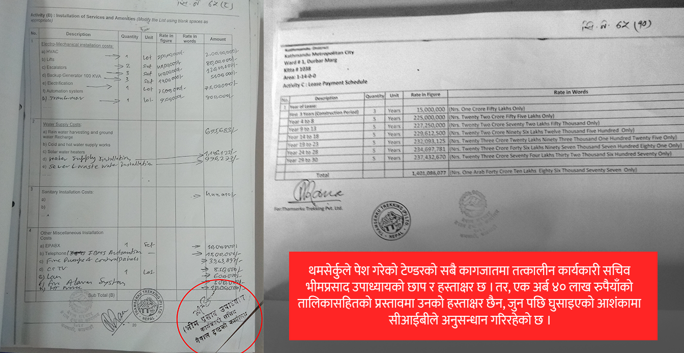 तर टेन्डर कागजातमा सुरुमा भवन निर्माण गर्दाको ३ वर्ष र त्यसपछिका ३० वर्ष लिज दिने कागजातमा भने थमसेर्कुले पूरै अवधिमा एक अर्ब ४० करोड रुपैयाँ बुझाउने प्रस्ताव पेस गरेको थियो ।