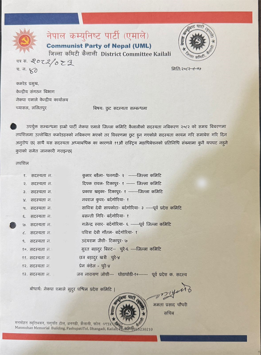 जिल्ला सचिव ममताप्रसाद अधिकारीले पार्टी केन्द्रलाई पत्र लेख्दै नवीकरण भइसकेको नामहरु छुट भएकाले विवरण सच्याउन आग्रह गरेका छन् ।