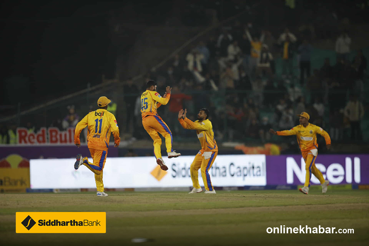 त्यसअघि पहिलो खेलमा विराटनगर किङ्सले पनि मध्यम योगफल डिफेन्ड गर्ने क्रममा कर्णाली याक्सविरुद्ध ९ रनको रोमाञ्चक जित निकाल्यो । विराटनगरको जितमा कप्तान सन्दीप लामिछानेले ४ ओभरमा ११ रन मात्र दिएर ४ विकेट लिए ।