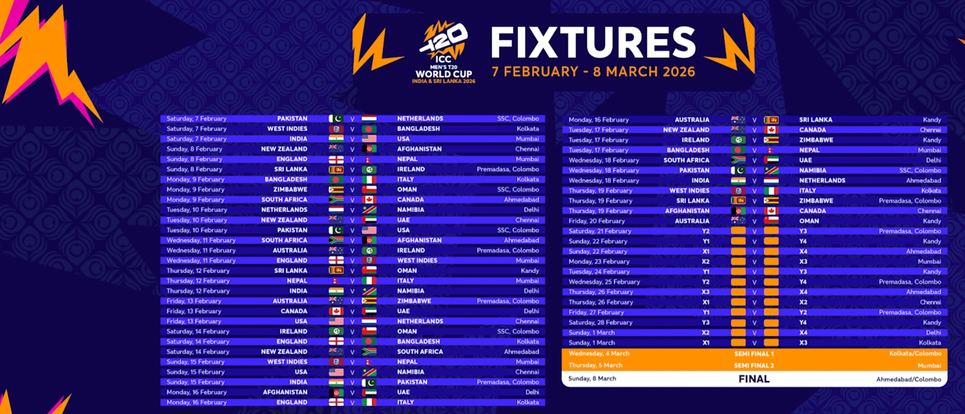 Generated by OK AI. Editorially reviewed.- आगामी फेब्रुअरी-मार्चमा भारत र श्रीलंकामा संयुक्त रूपमा हुने आईसीसी टी-२० विश्वकप क्रिकेटको समूह र खेलतालिका सार्वजनिक भएको छ।