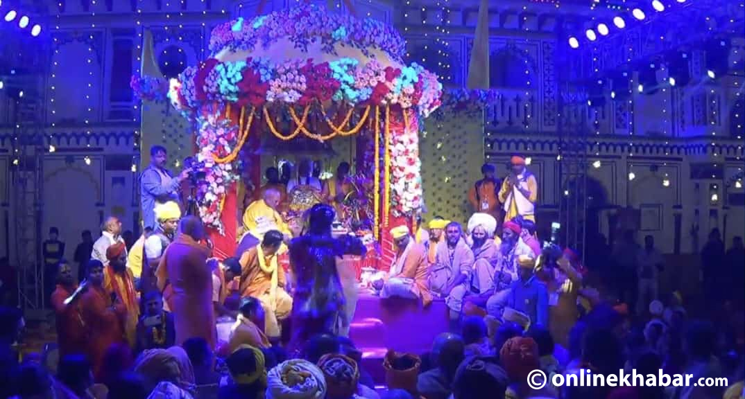 Generated by OK AI. Editorially reviewed.- जानकी मन्दिर प्राङ्गणमा मिथिला परम्परा अनुसार राम र जानकीको वैवाहिक कार्यक्रम सुरु भएको छ।