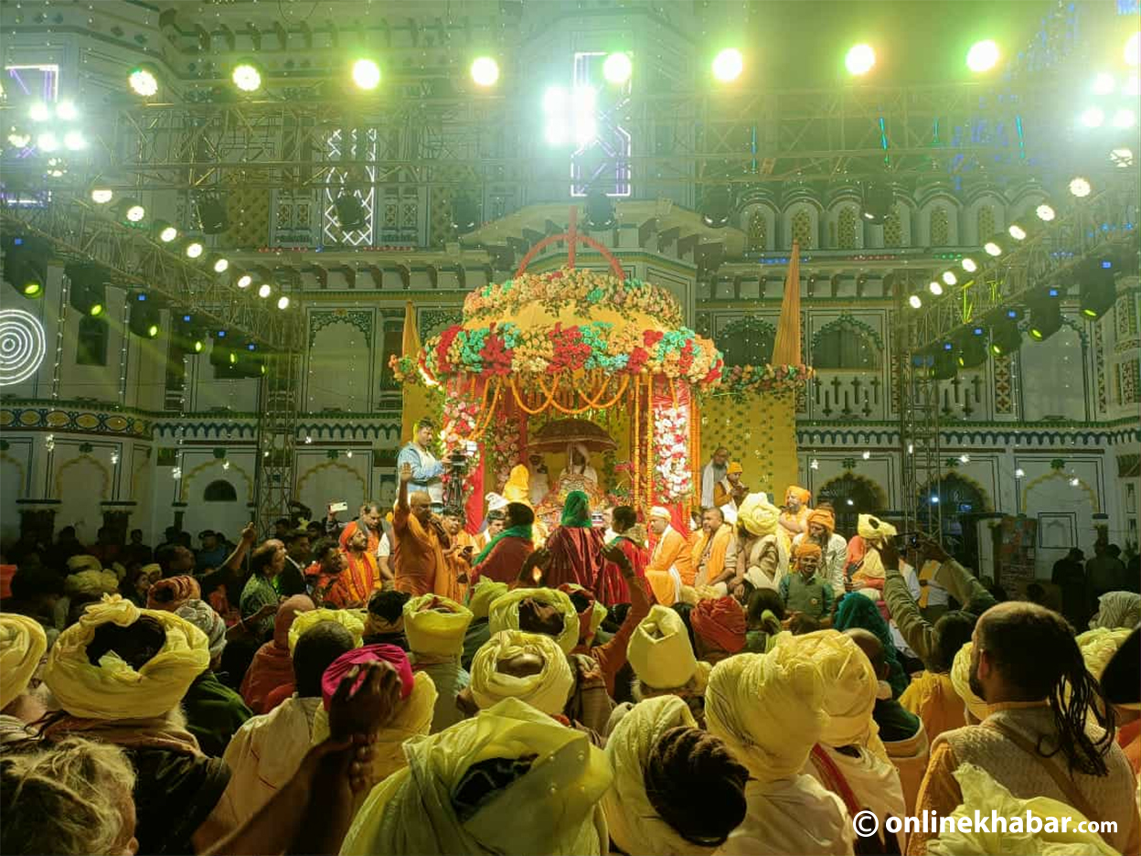 - डोला र स्वयम्बरको दर्शन गर्न जानकी मन्दिरदेखि बाह्रबिघा मैदानसम्म खचाखच दर्शनार्थीको भीड छ र हेलिकप्टरबाट पुष्पवृष्टि गरिएको थियो।