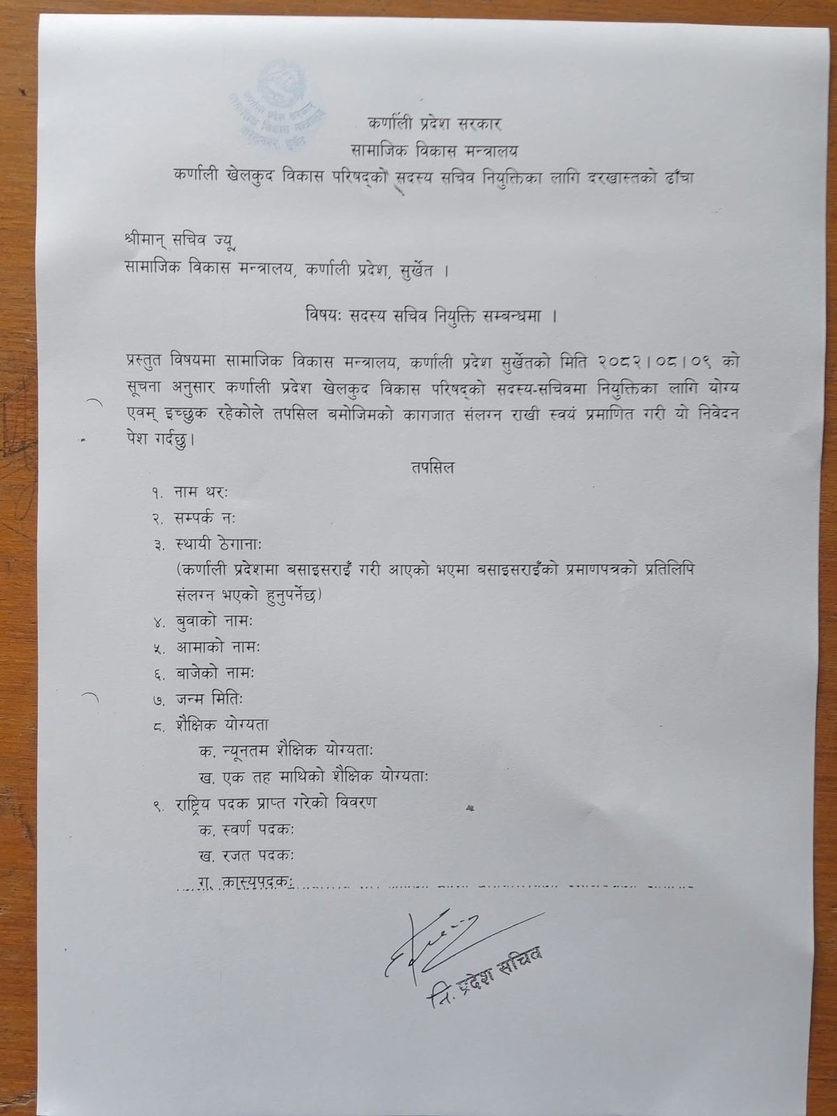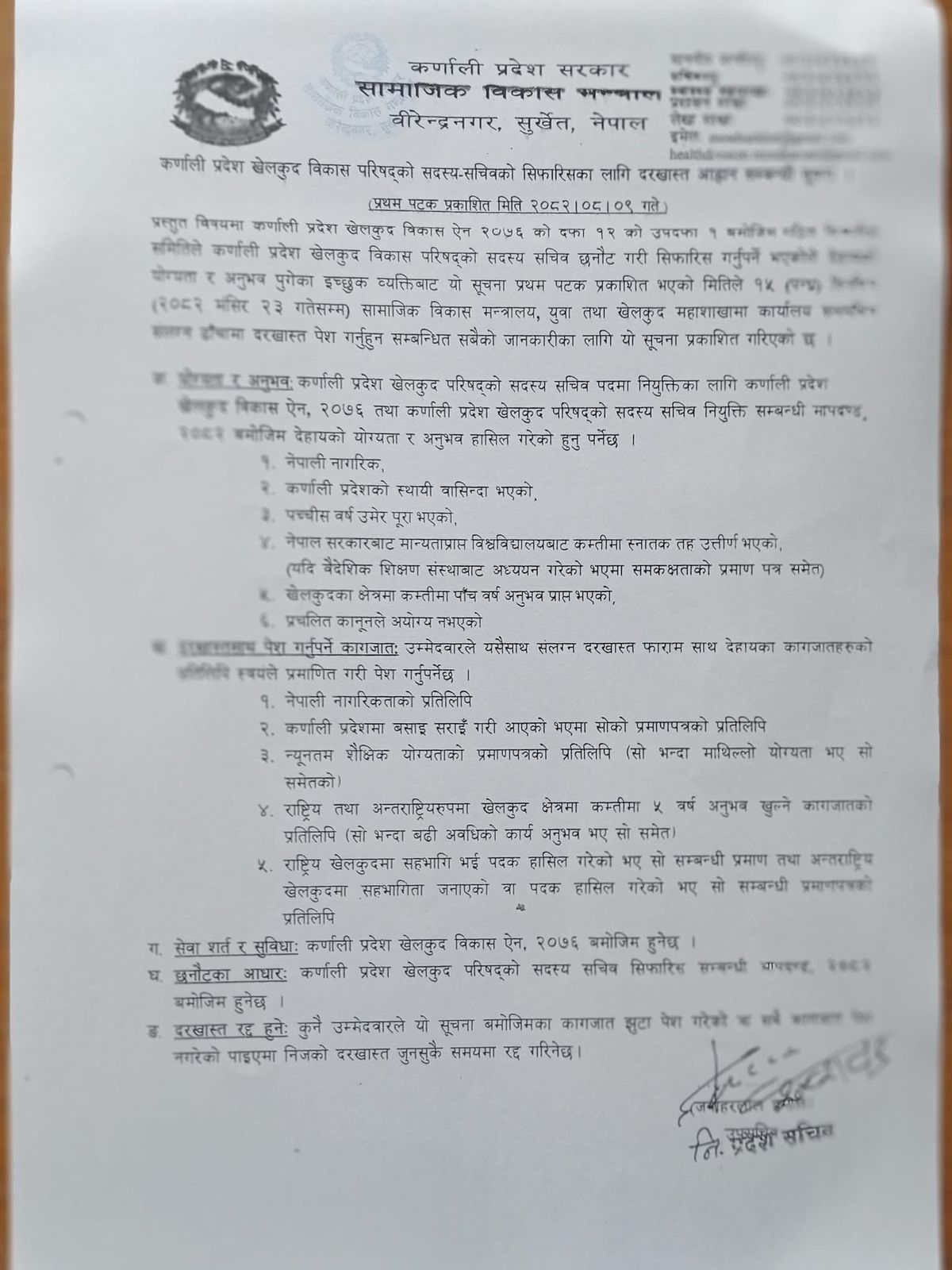 Generated by OK AI. Editorially reviewed.- कर्णाली प्रदेश सामाजिक विकास मन्त्रालयले ११ महिनापछि खेलकुद विकास परिषद्को सदस्यसचिव पदका लागि दरखास्त आह्वान गरेको छ।