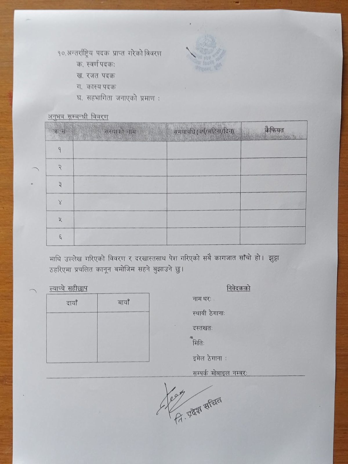 मन्त्रालयले मंगलबार (मंसिर ९) एक सूचनामार्फत दरखास्त आह्वान गरेको छ । योग्यता पुग्ने इच्छुक नेपालीले १५ दिनभित्र दरखास्त पेस गर्न सक्ने मन्त्रालयले जनाएको छ । कर्णाली प्रदेश खेलकुद विकास ऐन, २०७६ बमोजिम सूचना जारी गरिएको र सोही ऐनको प्रावधानअनुसार दरखास्त प्राप्त भएपछि थप प्रक्रिया अघि बढाइने मन्त्रालयले जनाएको छ ।