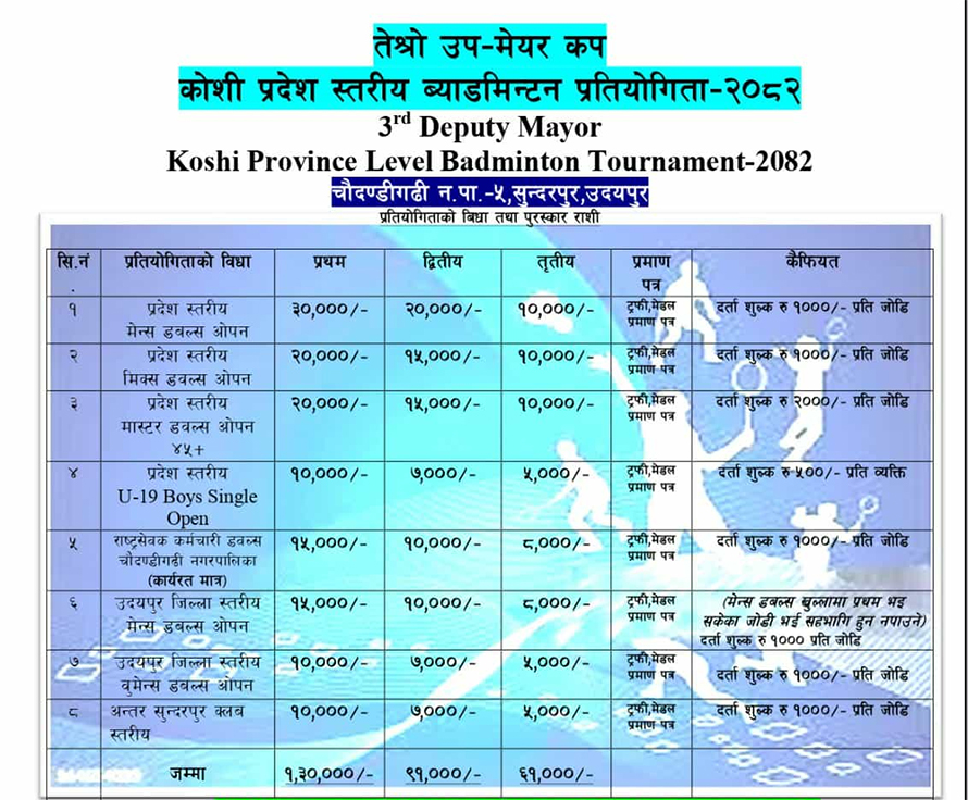 Generated by OK AI. Editorially reviewed.- उदयपुरको चौदण्डीगढी नगरपालिका–५ सुन्दरपुरमा तेस्रो उपमेयर कप कोशी प्रदेश स्तरीय ब्याडमिन्टन प्रतियोगिता–२०८२ आयोजना हुने भएको छ।