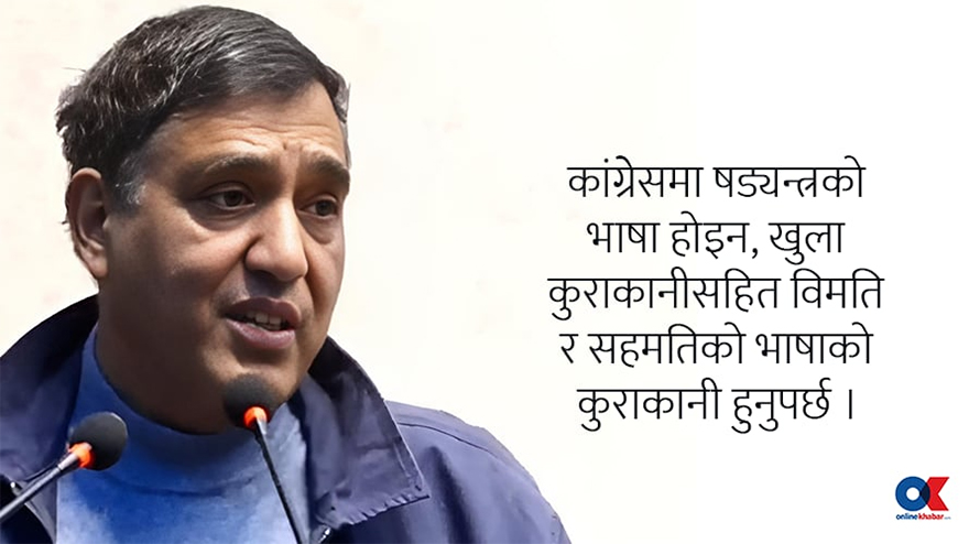 लोकतन्त्र र षड्यन्त्र सँगसँगै जानै सक्दैन, चाहे त्यो देशी वा विदेशी होस् । कांग्रेसका सदस्यहरूलाई आघात परेको छ । लोकतन्त्र पारदर्शी व्यवस्था हो । बोल्न पाउने व्यवस्था हो । कुरा गर्न पाउने व्यवस्था हो । मत मतान्तरमा लड्न पाउने व्यवस्था हो । षड्यन्त्र र लोकतन्त्र कहीँ पनि सँगसँगै जान सक्दैन । त्यसकारण, कांग्रेसमा षड्यन्त्रको भाषा होइन, खुला कुराकानीसहित विमति र सहमतिको भाषाको कुराकानी हुनुपर्छ ।