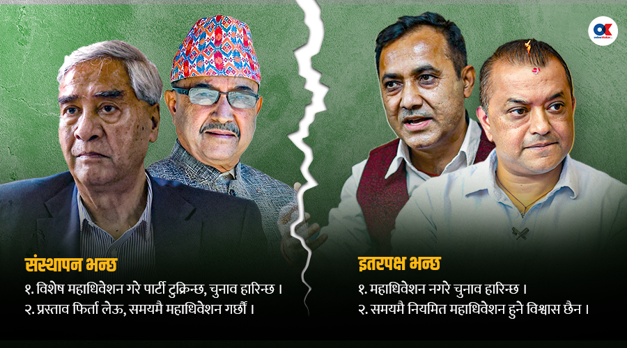 तर, विशेष महाधिवेशन पक्षधर संस्थापन पक्षको शर्त स्वीकार्न तयार देखिएको छैन । नियमित महाधिवेशन पुसभित्रै भए विशेष महाधिवेशनको माग स्वत: निष्क्रिय हुने उनीहरूको तर्क छ ।