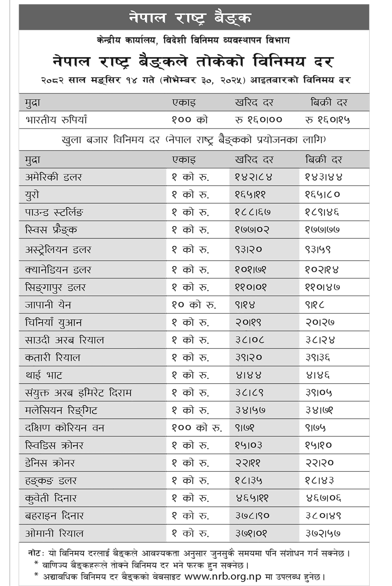 केन्द्रीय बैंकका अनुसार थाइ भाट एकको खरिददर चार रुपैयाँ ४४ पैसा र बिक्रीदर चार रुपैयाँ ४६ पैसा, युएई दिराम एकको खरिददर ३८ रुपैयाँ ८९ पैसा र बिक्रीदर ३९ रुपैयाँ ०५ पैसा, मलेसियन रिङ्गेट एकको खरिददर ३४ रुपैयाँ ५७ पैसा र बिक्रीदर ३४ रुपैयाँ ७१ पैसा, साउथ कोरियन वन १०० को खरिददर नौ रुपैयाँ ७१ पैसा र बिक्रीदर नौ रुपैयाँ ७५ पैसा, स्वीडिस क्रोनर एकको खरिददर १५ रुपैयाँ ०३ पैसा र बिक्रीदर १५ रुपैयाँ १० पैसा र डेनिस क्रोनर एकको खरिददर २२ रुपैयाँ ११ पैसा र बिक्रीदर २२ रुपैयाँ २० पैसा तोकिएको छ ।