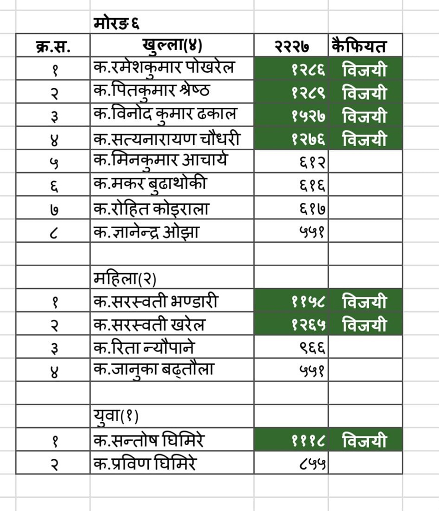 मोरङमा प्रतिनिधिसभाका ६ र एक दलित गरी ७ वटा निर्वाचन क्षेत्र थिए । क्षेत्र नम्बर ४ को पनि मत परिणाम सार्वजनिक भएको छ । सो क्षेत्रबाट ६ प्रतिनिधि मध्ये संस्थापन समूहबाट पाँच जना निर्वाचित भए । एक जना पोखरेल समूहबाट निर्वाचित भए ।