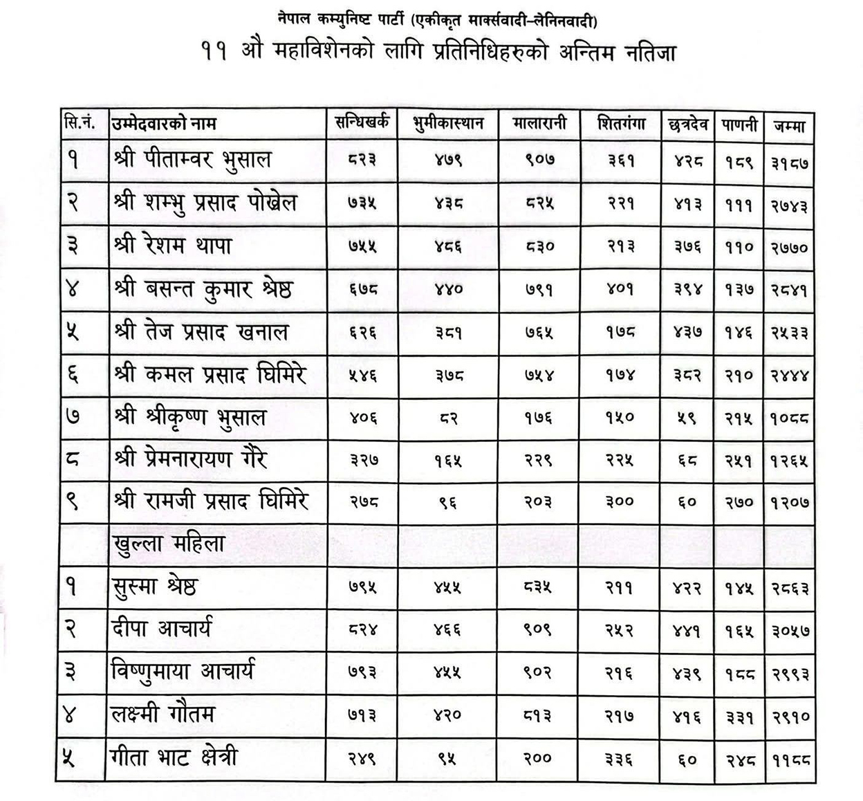निर्वाचन कमिटी अर्घाखाँचीका अनुसार कुल ३ हजार ६५० मतमध्ये पुरुष खुल्लातर्फ पिताम्बर भुसाल ३ हजार १८७ मतसहित विजयी हुँदा घिमिरे १ हजार ९८० मत अन्तरले पछि परे ।