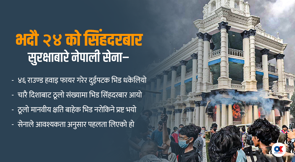 नेपाली सेनाले लिखित जवाफमा भनेको छ, ‘ठूलो संख्यामा चारै दिशाबाट हुल आक्रोशित हुँदै सिंहदरबार प्रवेश गरेपछि ठूलो मानवीय क्षति बाहेक भिड नरोकिने प्रस्ट भएपछि समग्र घटनाहरूमा शान्ति सुरक्षा कायम गर्ने उद्देश्यका साथ नेपाली सेनाले आवश्यकता अनुसार पहलता लिएको हो ।’