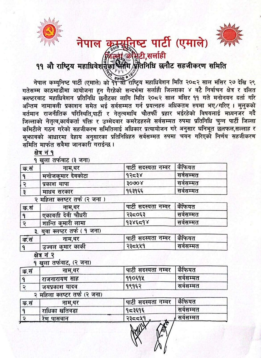 १४ मंसिर, सर्लाही । नेकपा एमाले सर्लाहीबाट सबै महाधिवेशन प्रतिनिधि निर्विरोध चयन भएका छन् ।